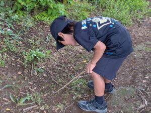 落ちている枝でアメリカシロヒトリを捕まえ、なべに入れてどうやって逃げ出すのかを見守ったり、木の枝をなべにたてかけて、逃げ出しやすいような工夫をしたり・・・