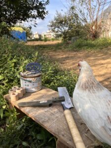 こないだ作ったタイプと同じ感じに、まず四本足を立てて、支えになる横棒もつける作戦。エイタもトンカチ頑張ってたよね。