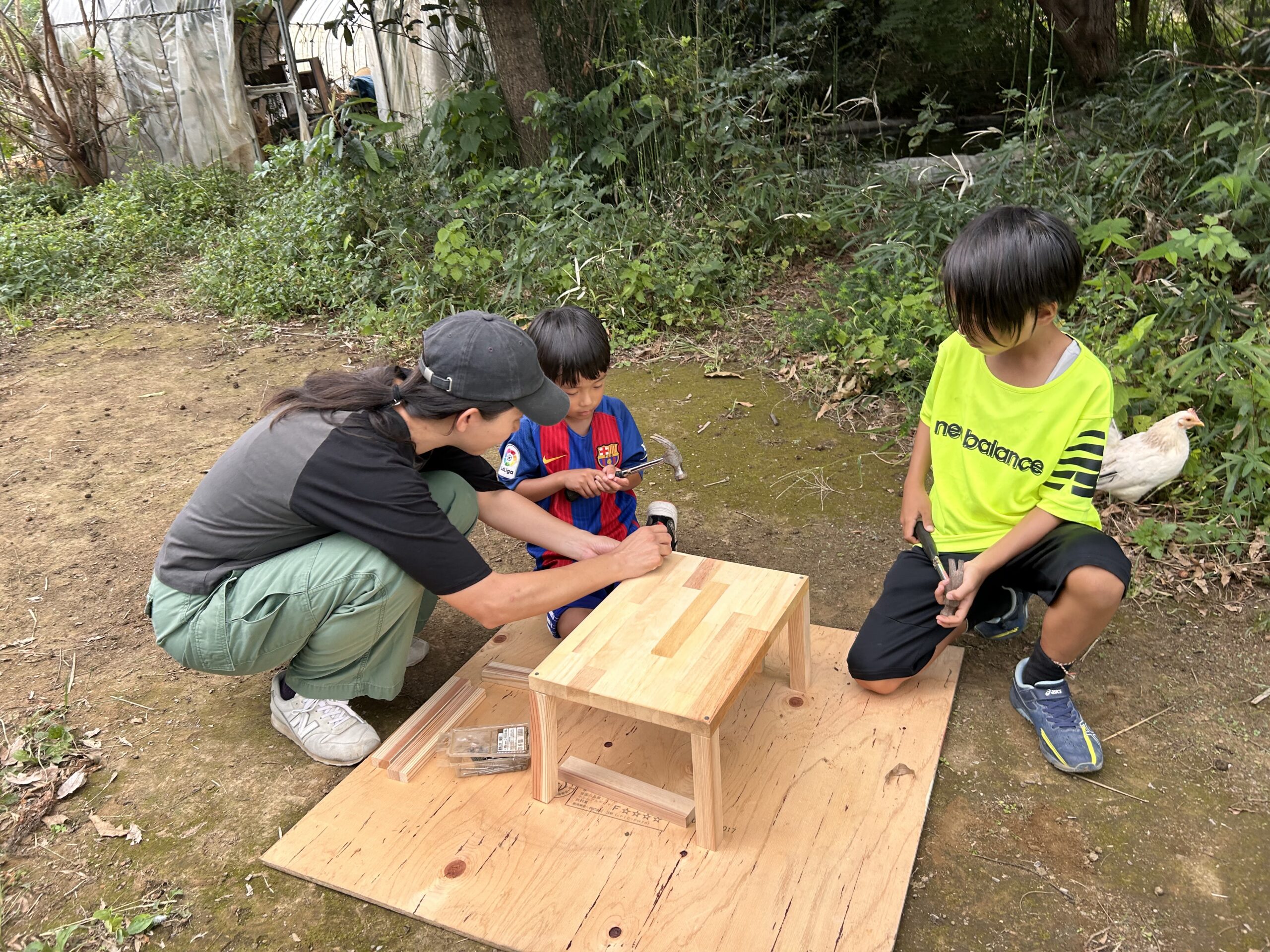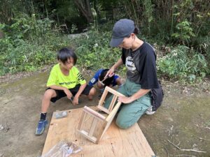 今日はハルマとエイタは来るなり、テーブルを作りたいと決まっていたので、すぐに事務所に木をもらいに行って、作り始めたよ。