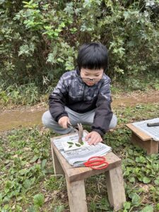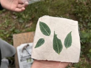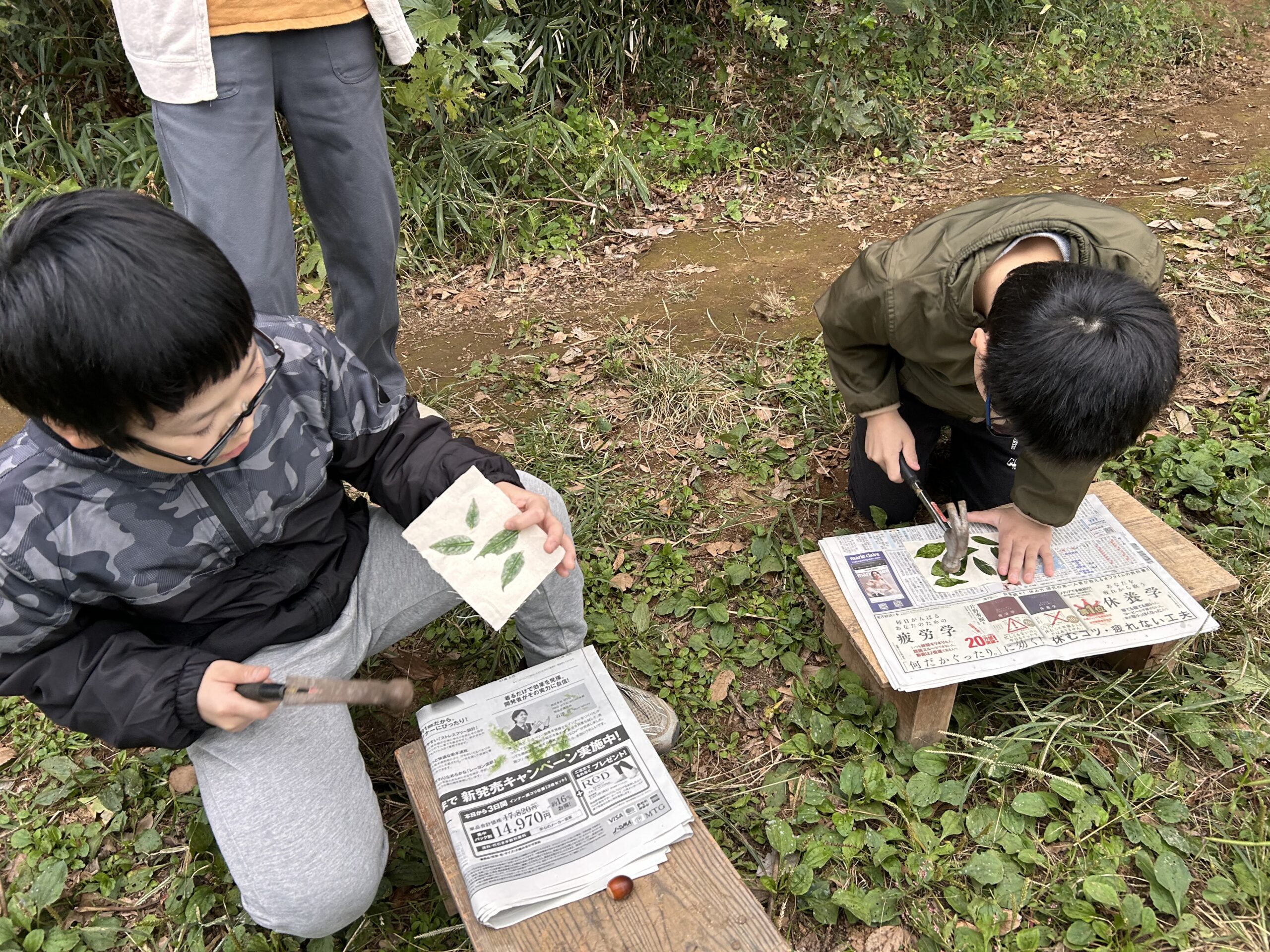ユイタも挑戦。ガンガンと強く叩くと葉脈が潰れて綺麗に繊維よ様子が写らないよ。