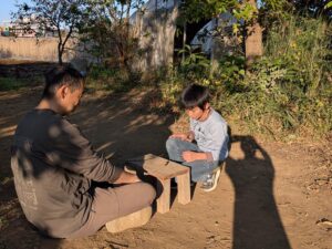最初はベーゴマの練習からスタート。何度も挑戦しているうちに、少しずつ台の上で回せるようになりました。