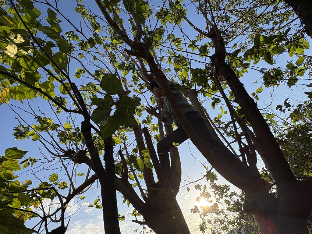 どんぐり小屋越しに見る夕陽がとてもきれいで、木登りする姿も絵になりますね。