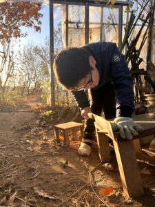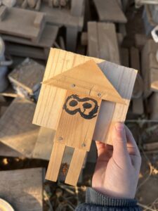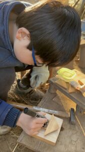 ちょうど良い感じの木材を拾ってきて、イカくんの形を作っていったよ。ユイタはとても器用で切りやすいようにノコギリで線を入れてあげれば、上手に切るし、小さな釘をトンカチで打つのも上手!