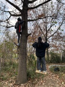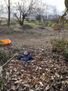 ユイタが来て一緒に落ち葉はき。ユイタは落ち葉穴の中に潜るのが大好き。そして転がって上を見るのも大好き。