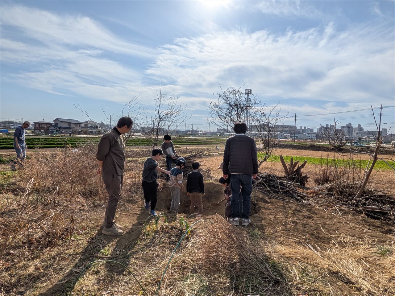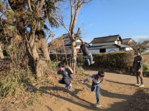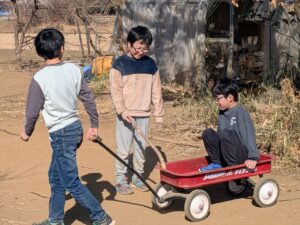その後は、野球やゴルドン、羽子板、大縄、ブランコ、お父さんが剪定した桑の枝を、手押し車に乗せて運んだり(これも楽しい遊び)と、それぞれが思い思いの時間を過ごしました。