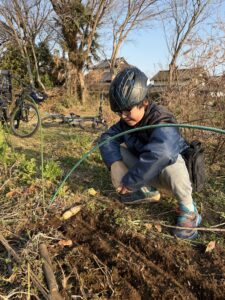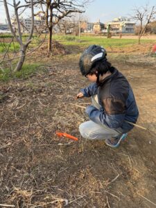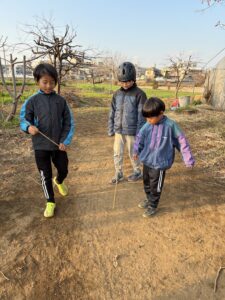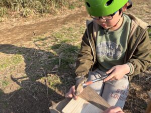 それを投げて刺す遊び。葉っぱを貫いたりして、結構危険な武器に仕上がっていたよ。イチタも初めてのナイフに挑戦してた。