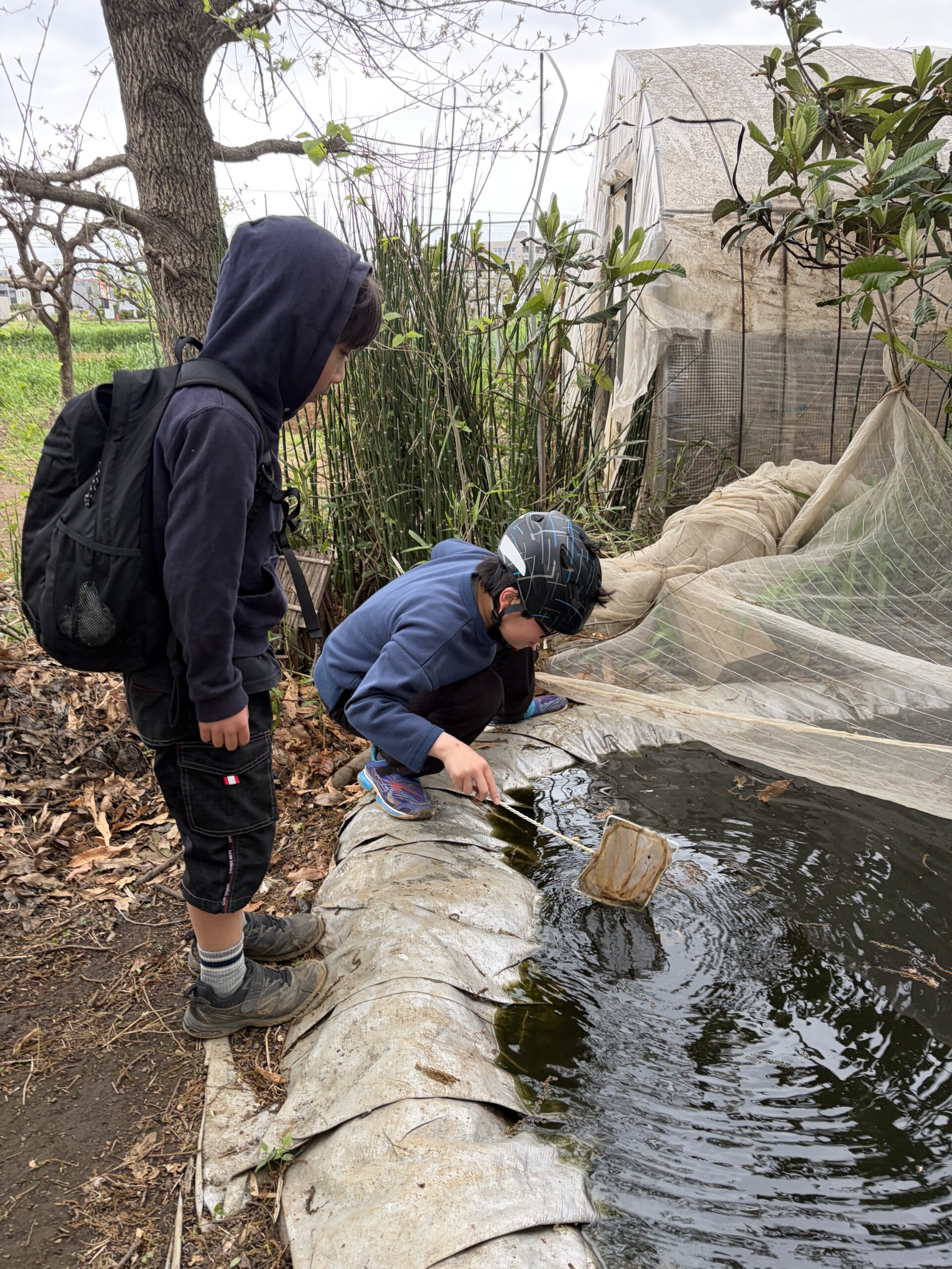 池にクヌギの花が落ち始めたから、なるべく取るようにしてるよ。クヌギの花は水に入ると、水が黒くなっちゃうんだ。それで魚が死んじゃうことはないようなんだけど、真っ黒の水じゃ可哀想だもんね。