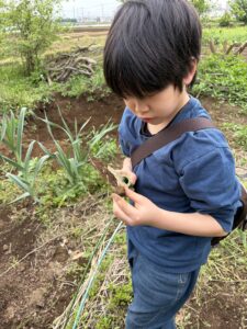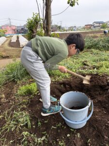 ここの腐葉土は落ち葉穴から掘り出したもの。これが一年前に落ち葉だったなんて信じられないよね! この腐葉土を畑に還して夏野菜を植えるんだ。